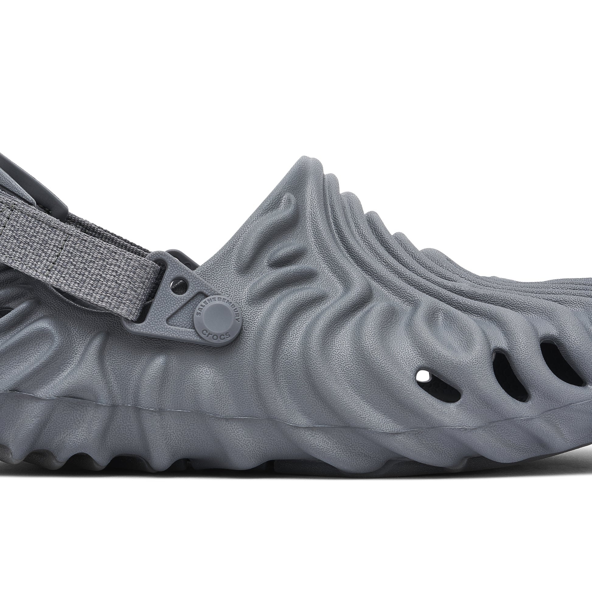 The Crocs Pollex Clog x Salehe Bembury Niagara captivates with its avant-garde silhouette and unique wave-like texture. Bathed in a cool grey hue, its moulded design features strategic cut-outs for airflow and a dynamic aesthetic. The adjustable heel strap adds practicality and stability, ideal for both urban exploration and relaxed outings. Crafted for comfort, the cushioned sole ensures optimal support, while the textured grip enhances traction. Perfect for making a bold fashion statement, this collaboration harmoniously blends futuristic style with everyday functionality, seamlessly elevating streetwear and casual ensembles alike.